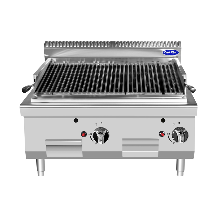Griglia pietra lavica da banco doppia a gas serie 700 -struttura in acciaio inox AISI 430 - top in acciaio Inox Aisi -304 1.5 mm -griglia in acciaio Inox Aisi 304 -sistema di cottura a pietra lavica -sistema di accensione piezzoelettrico -cassetto recupero residui - n. 2 bruciatore da 7 kw -leva alza griglia - dim. 800x700x547 h