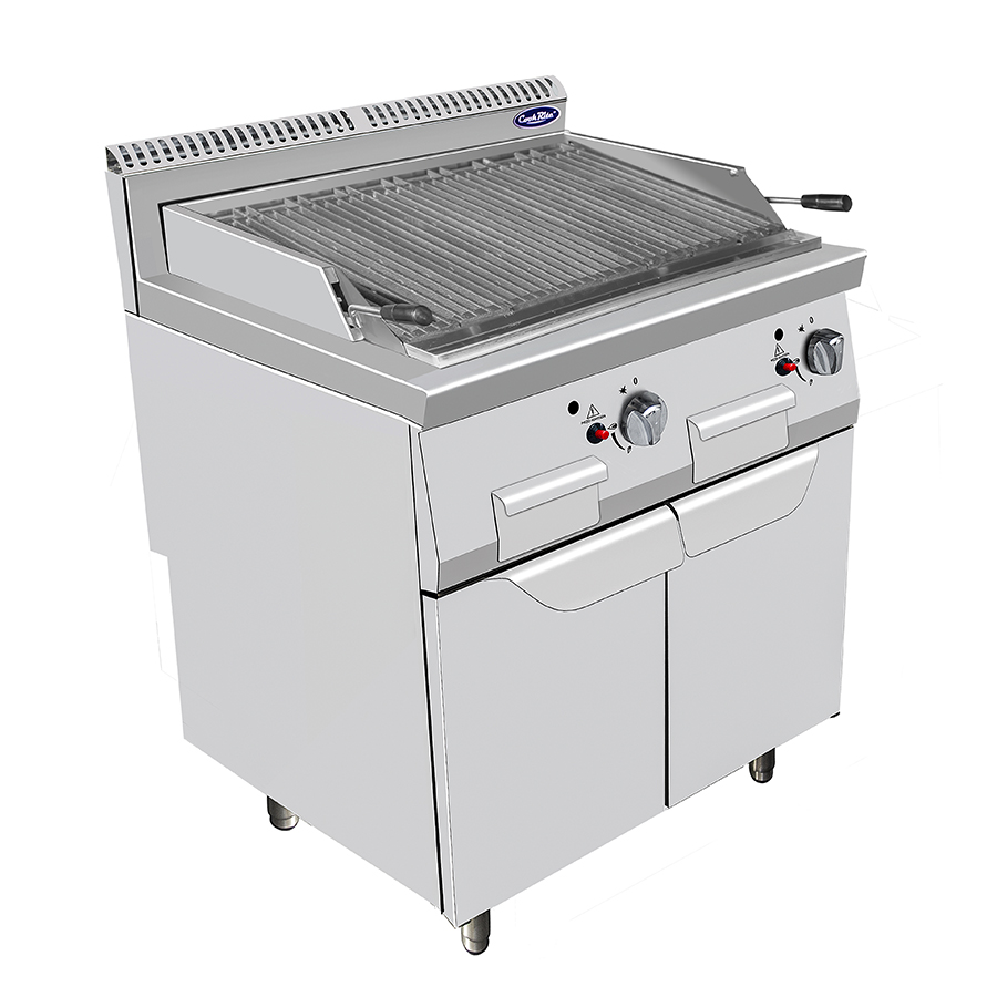 Griglia pietra lavica doppia serie 700 -struttura in acciaio inox AISI 430 – top in acciaio Inox Aisi -304 1.5 mm -griglia in acciaio Inox Aisi 304 -sistema di cottura a pietra lavica -sistema di accensione piezzoelettrico -cassetto recupero residui – n. 2 bruciatore da 7 kw -leva alza griglia – dim. 800x700x1085 h